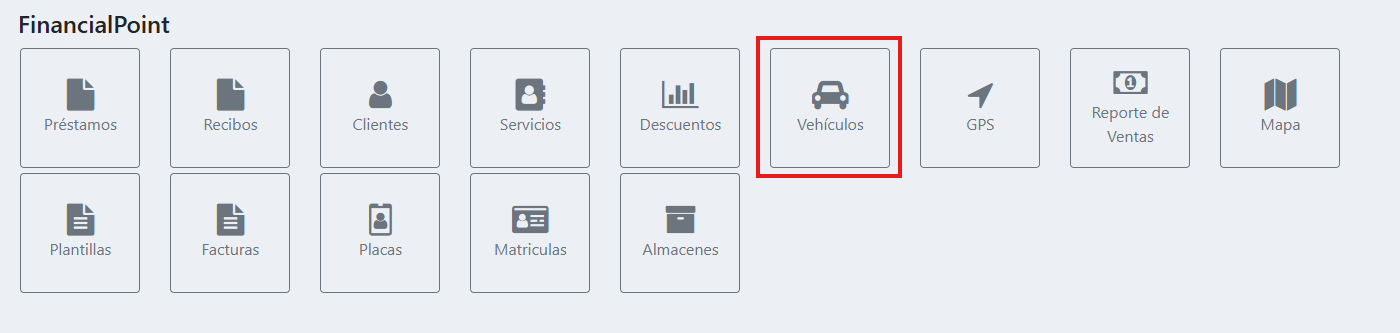 Para iniciar la administración de su inventario automotriz, diríjase al Panel Principal. Dentro del conjunto de herramientas operativas, localice y seleccione el botón identificado con el ícono de un automóvil, titulado "Vehículos"