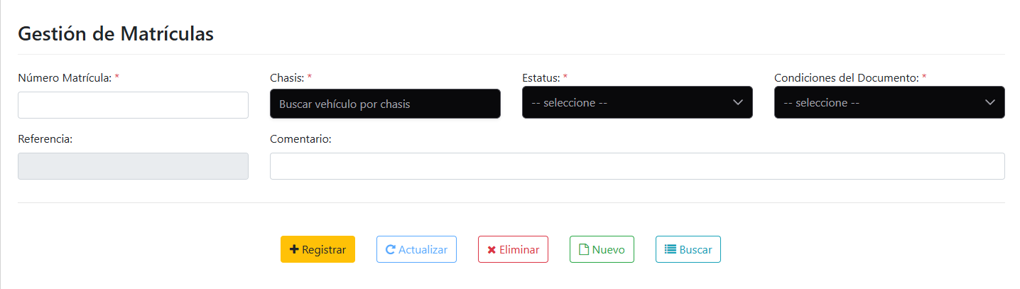 Tras verificar que el número de matrícula coincida con el físico y que el chasis seleccionado sea el correcto, haga clic en el botón amarillo "+ Registrar" para guardar la operación. Utilice los botones auxiliares "Actualizar" o "Eliminar" solo cuando necesite modificar o corregir registros existentes.