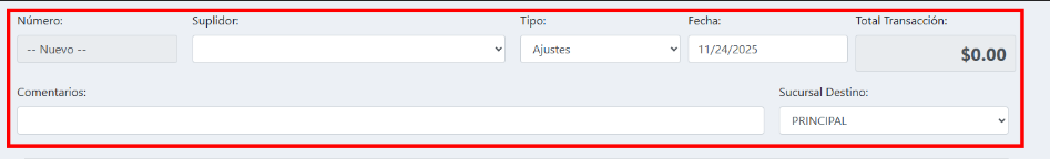 Una vez se encuentre en la interfaz de inventario, el primer paso consiste en definir los parámetros generales de la transacción en la sección superior de la pantalla.