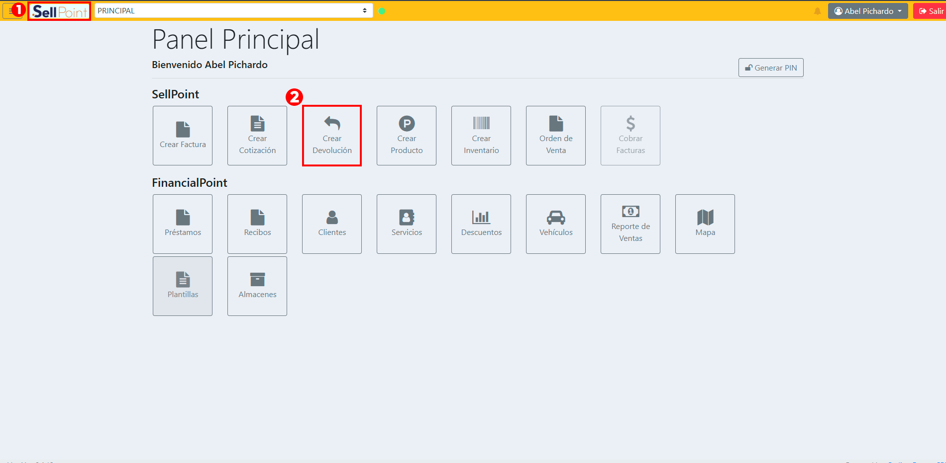 En el menú principal de SellPoint se encuentra la opción de crear devoluciones.