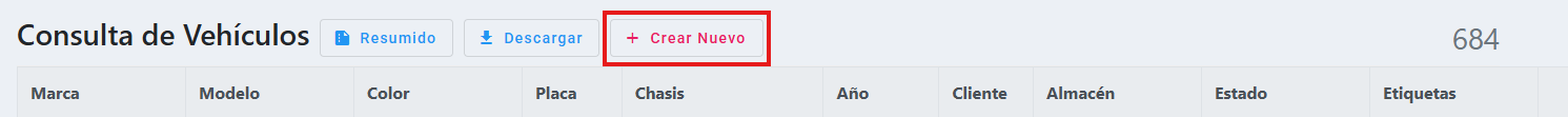 Esta acción le dirigirá a la pantalla de consulta donde encontrará todos los vehículos registrados anteriormente, arriba se encontrará en rojo la opción "+ Crear nuevo"