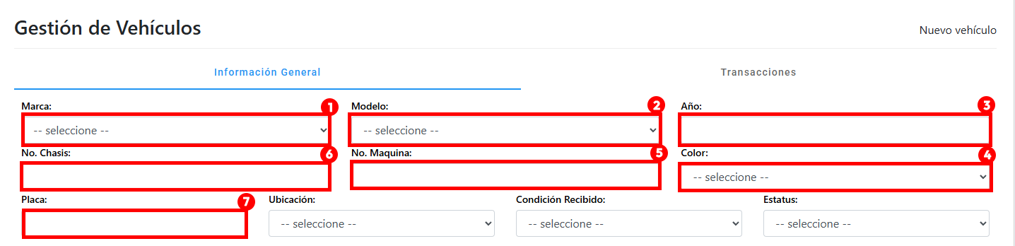 Nota: La pestaña "Transacciones" (visible en la parte superior del formulario de registro) se irá poblando automáticamente con los Préstamos y Facturas que se generen y vinculen a este vehículo específico a lo largo del tiempo