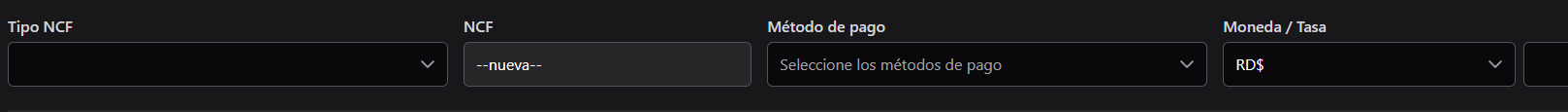 Comprobantes Fiscales: En el campo "Tipo NCF", seleccione la clasificación fiscal correspondiente (ej. Crédito Fiscal, Consumidor Final). El sistema generará el NCF secuencial automáticamente.