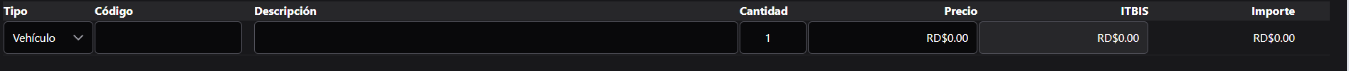 Valores: Introduzca la Cantidad y el Precio unitario. El sistema calculará automáticamente el ITBIS (impuesto) y el Importe total de la línea.