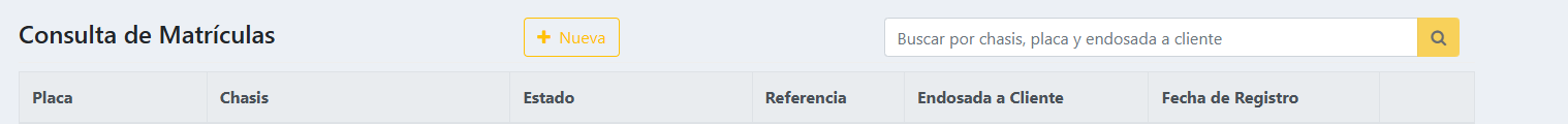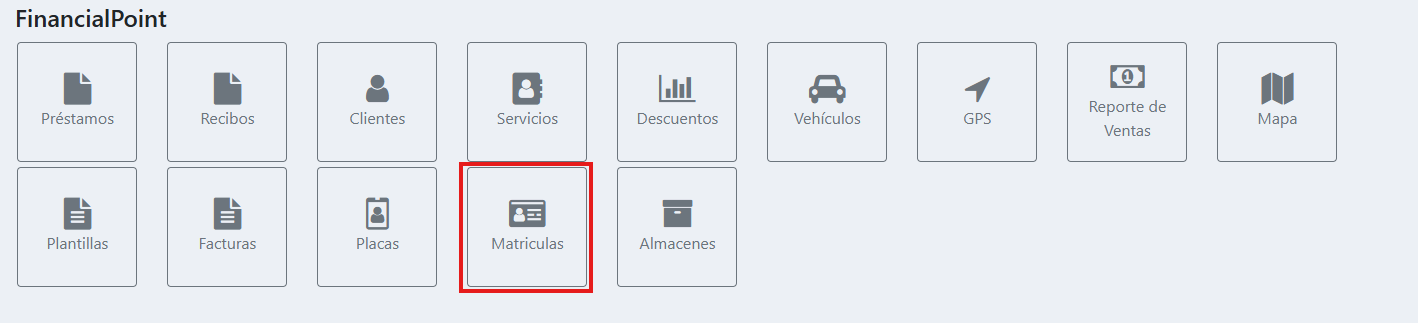 Para administrar el registro de los documentos de propiedad de los vehículos, diríjase al Panel Principal. Dentro de las herramientas operativas, localice y seleccione el botón identificado con el ícono de una tarjeta de identificación horizontal, titulado "Matriculas". Al acceder, entrara al apartado de consulta de matrículas donde estarán las matrículas anteriormente registradas