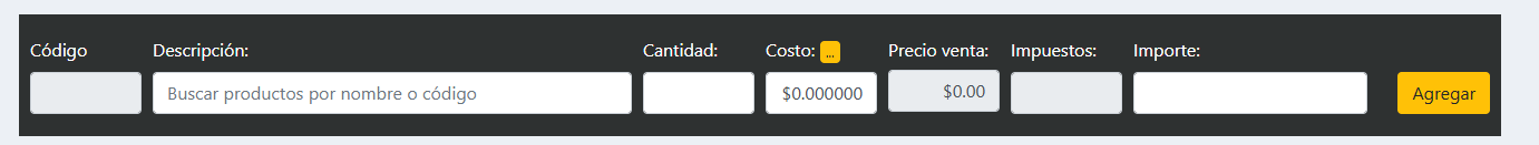 La sección central del formulario está diseñada para la introducción detallada de los artículos. Utilice la barra de búsqueda principal para localizar el producto deseado, ya sea escribiendo su nombre o con su código de referencia. A continuación, deberá completar los valores: especifique el número de unidades en el campo "Cantidad", el valor de adquisición en "Costo" y, si el sistema lo habilita, el precio final al público en "Precio venta". Para incorporar el artículo a la transacción actual, presione el botón "Agregar". Notará que el producto se transfiere inmediatamente a la tabla de desglose inferior, confirmando su inclusión en el movimiento.